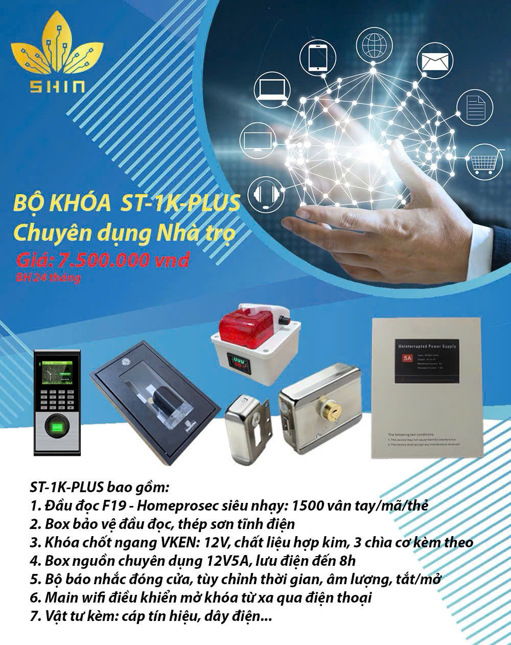 - Khóa cổng vân tay HomeProsec ST-1K-PLUS là dòng khóa cổng chuyên dành cho nhà trọ, đáp ứng yêu cầu đóng mở liên tục hàng ngày Chức năng mở khóa: vân tay, mật khẩu, chìa cơ, app wifi, remote