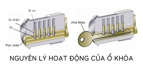 – Khi tra chìa vào ổ, bi chìa được đẩy đúng vị trí → lõi khóa xoay.